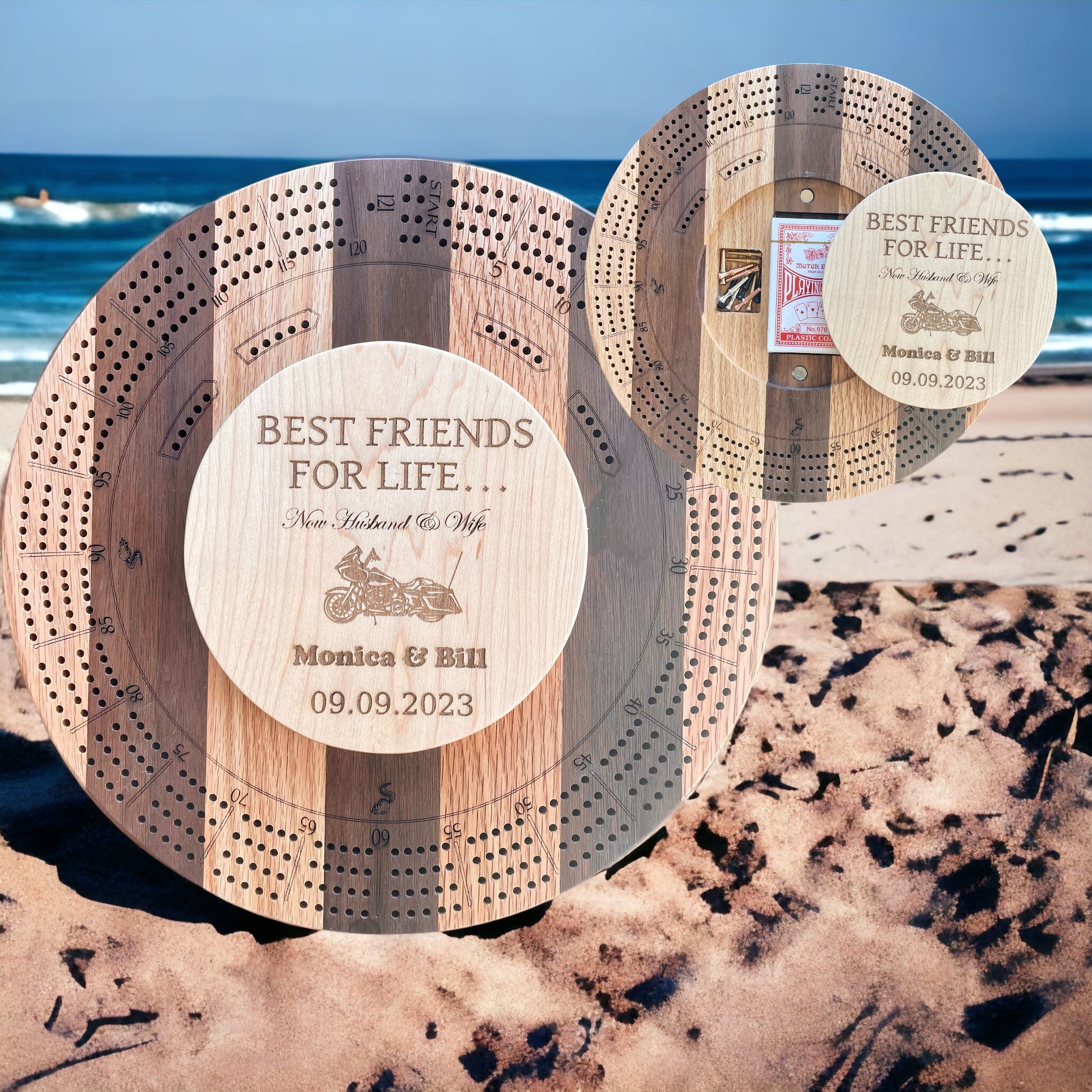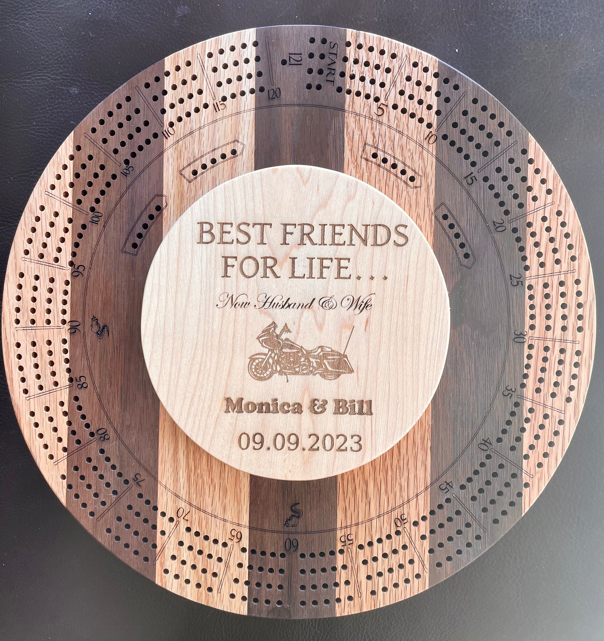4 player cribbage board. Internal compartment for storing pins and cards. Features magnets to hold the lid securely to the board. Hand-crafted in Dexter, Or. Materials: - The base is made of Red Oak and wall net - The top is personalized. The base of the board is 11.5" in diameter.