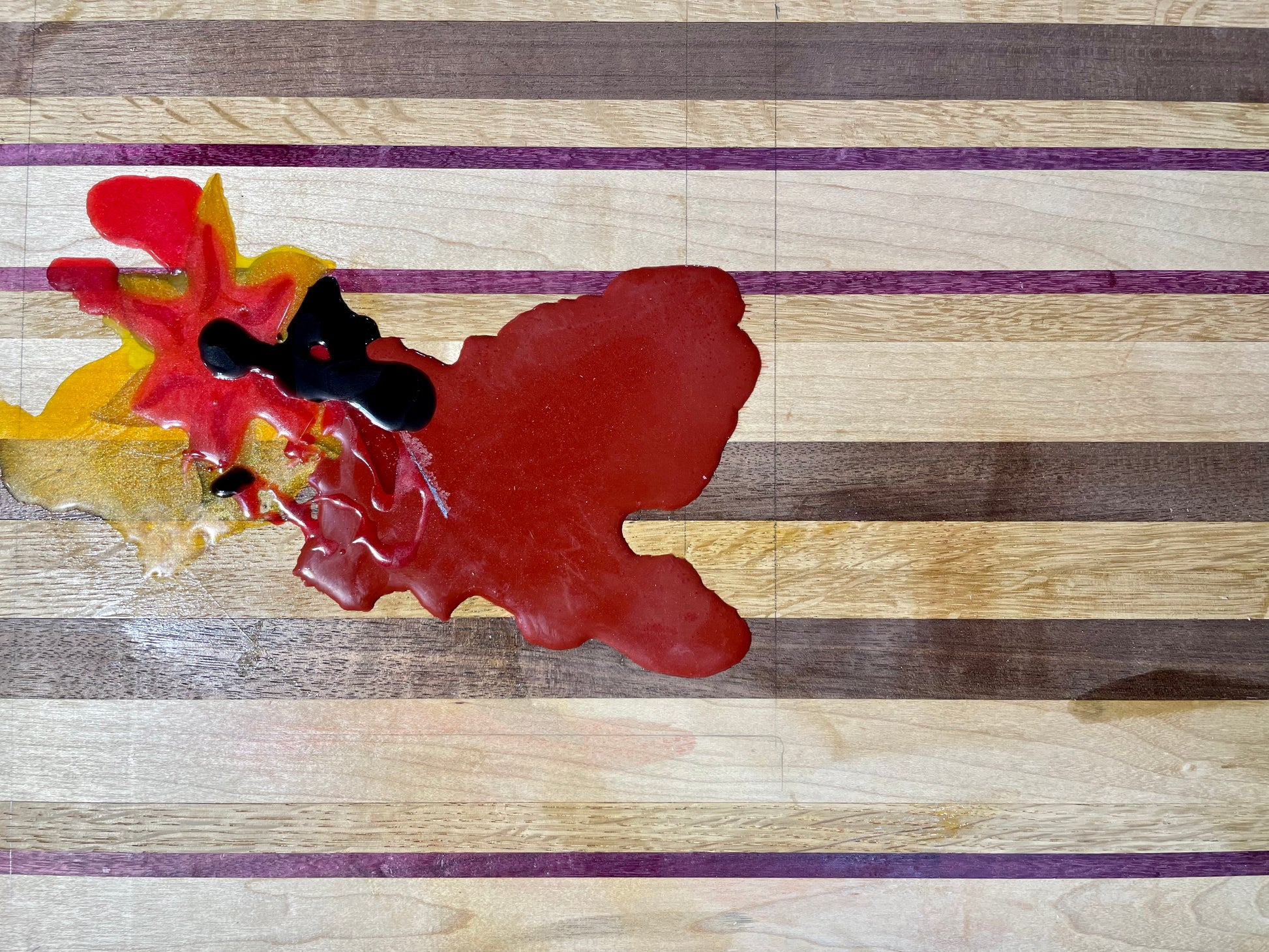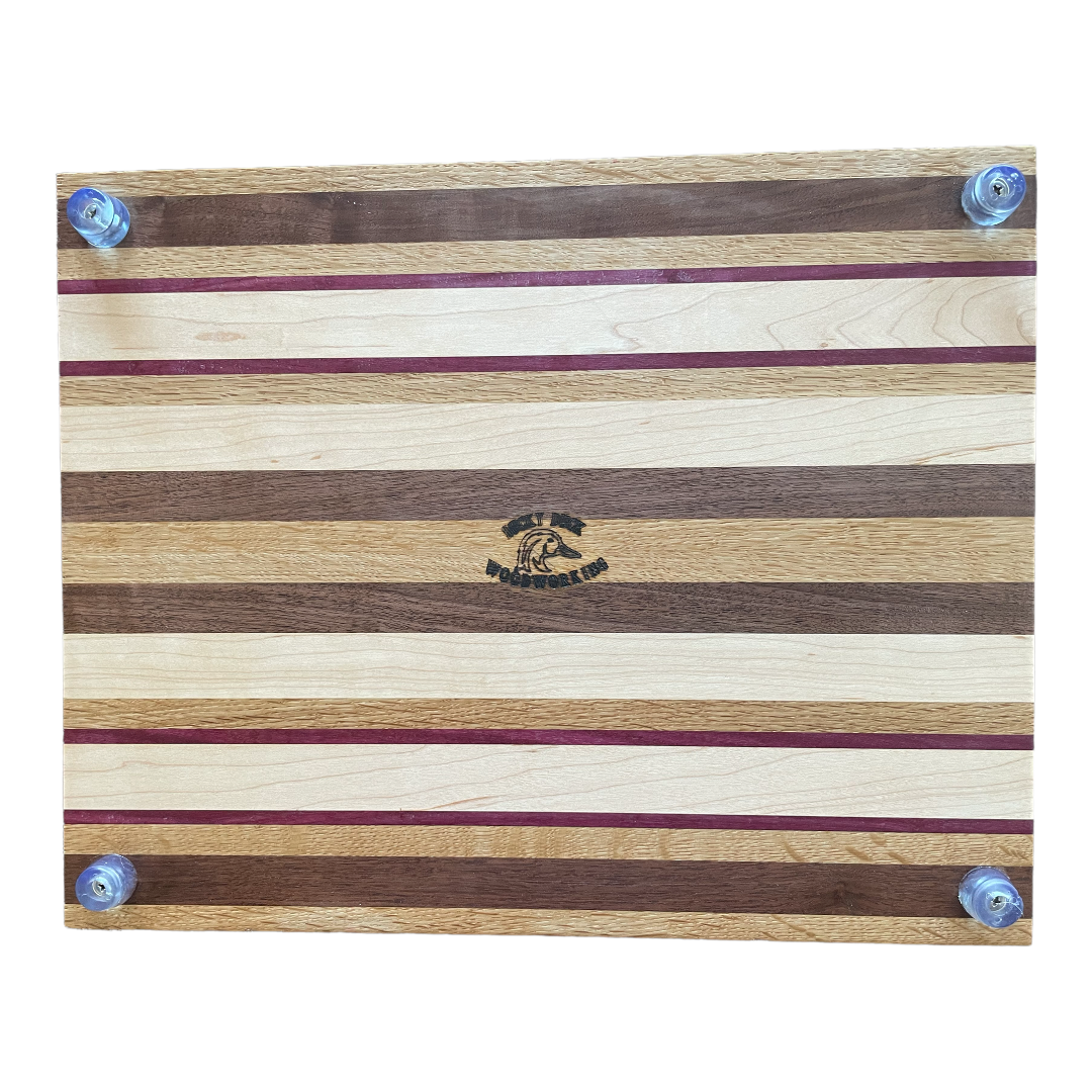 Epoxy inlay with 3/4” juice groove. Check out the video to see how it was made. Note I have positioned the epoxy art to the top left of the board for maximum cutting area just in case you choose not to cut on the image. And to protect both your countertop and the board there are four nonslip feet.