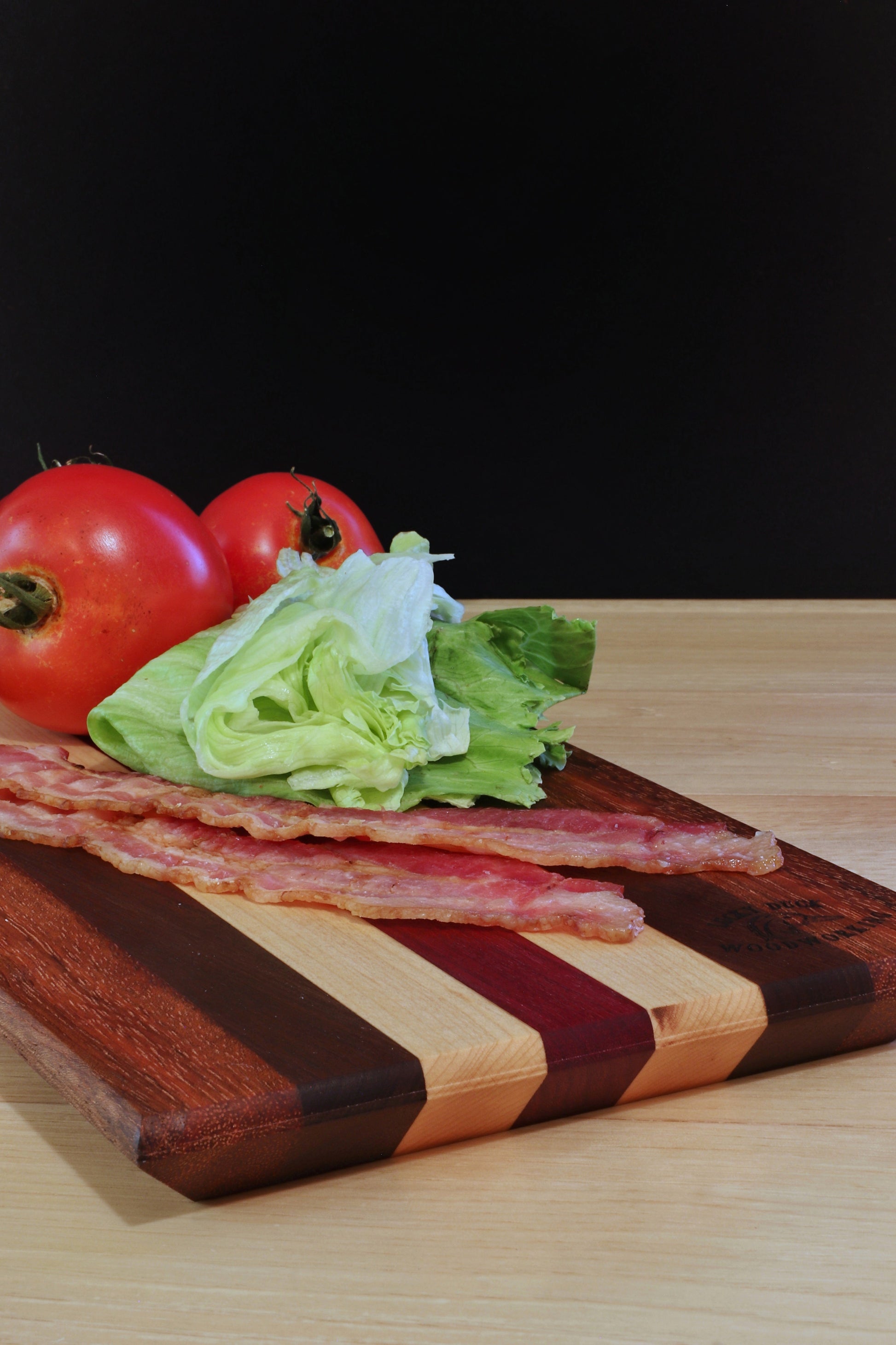 Face grain cutting board. Great for cutting bread, dicing vegetables. When not in use, turn it over and use it as a display. Small footprint makes it ideal to leave out on your countertop for quick and easy access. Wash with mild soap and do not place in dishwasher or soak in water. Approximately: 13" x 6" x 1"