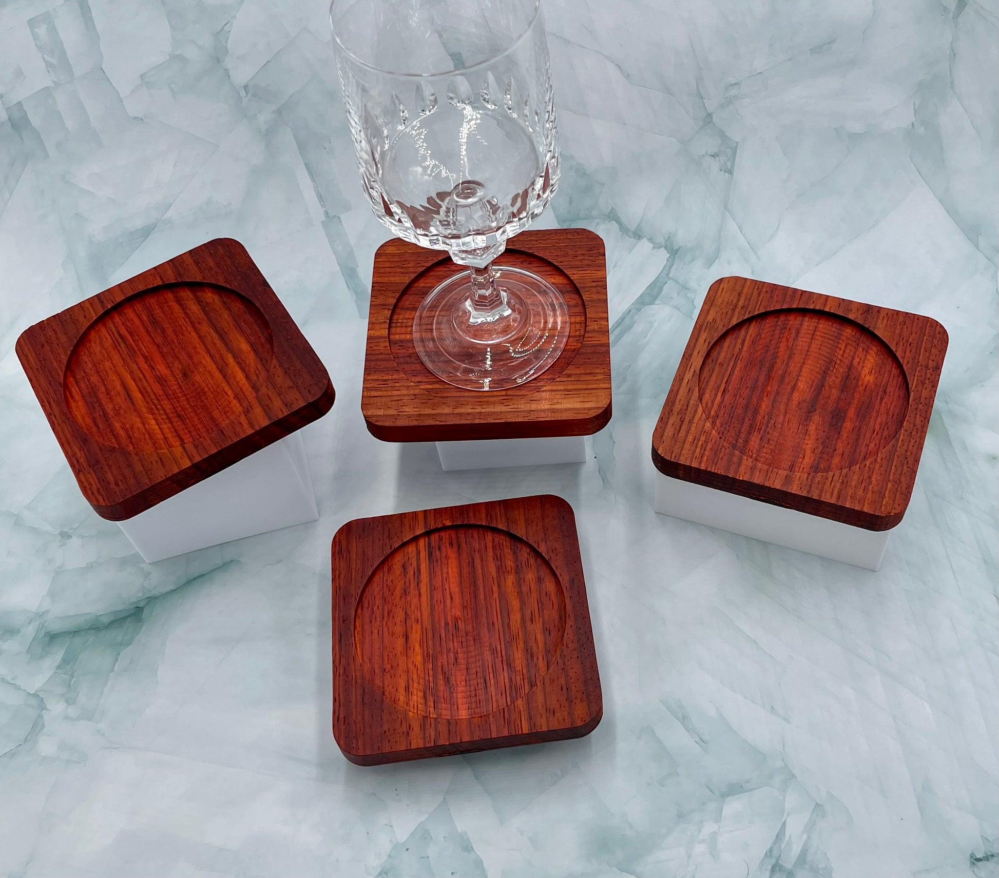 Solid wood coaster made from Padauk wood. Padauk will eventually turn a dark reddish brown over time. A set equals 4 coasters.